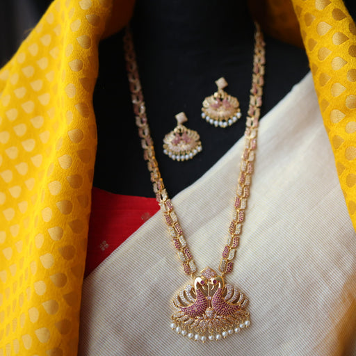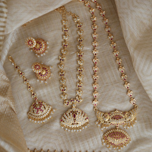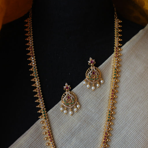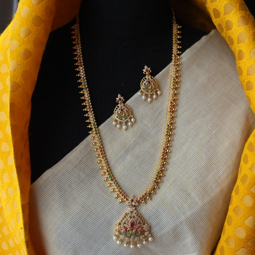 View full detailsHeritage gold plated ruby white stone long necklace with earrings HL00252