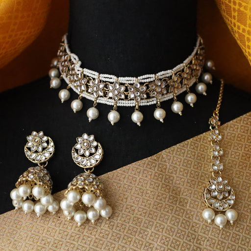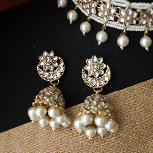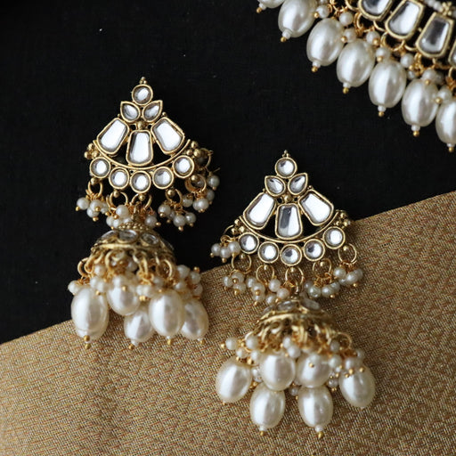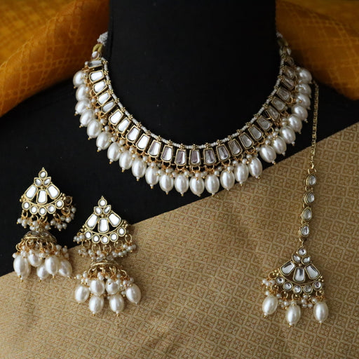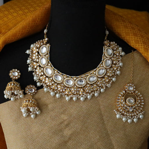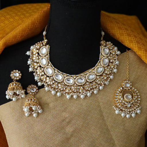 Heera white Kundan stone and pearls necklace with earrings and tikka 1763344