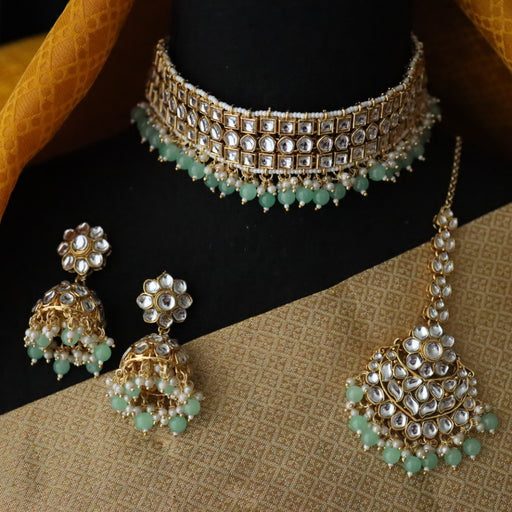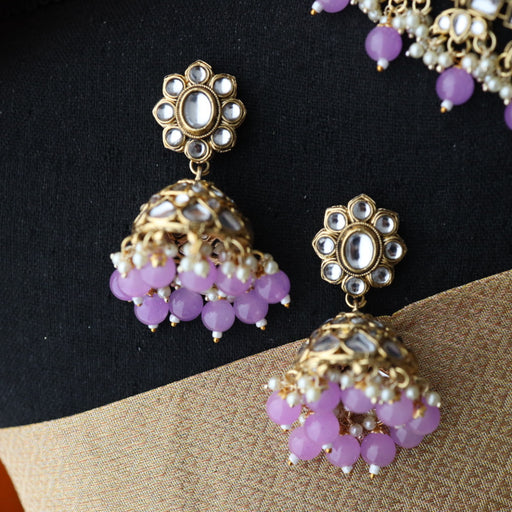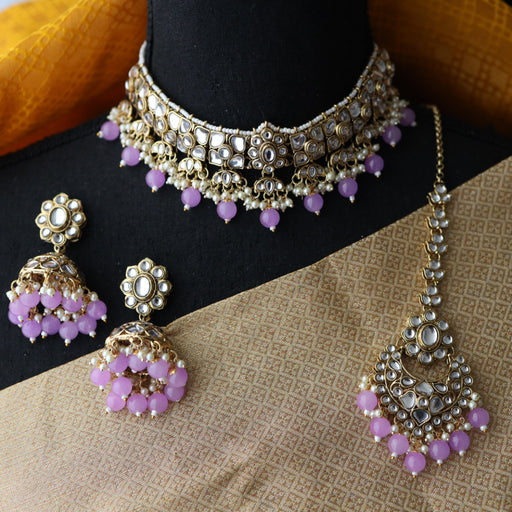 View full detailsHeera white Kundan stone and purple pearls choker with earrings and tikka 1763340