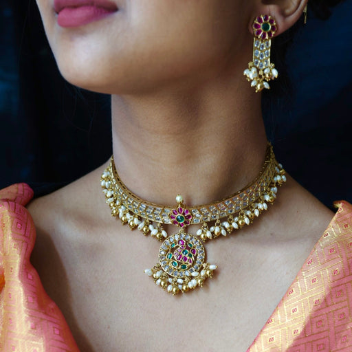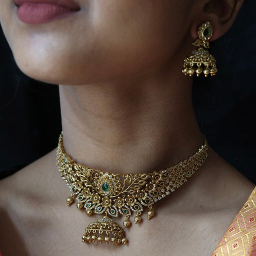 View full detailsHeritage gold plated white stone choker necklace with earrings CCB1349