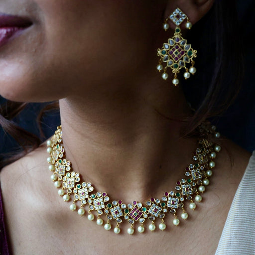 View full detailsAntique ruby stone pearl short necklace with earrings TTS433
