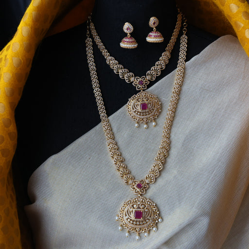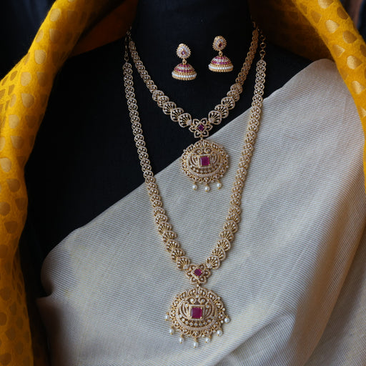 View full detailsHeritage gold plated ruby stone long and short necklace with earrings HLS1689