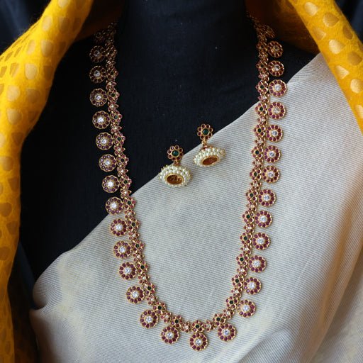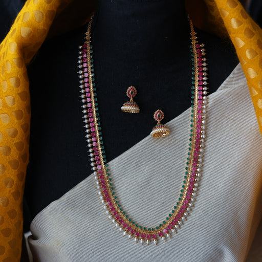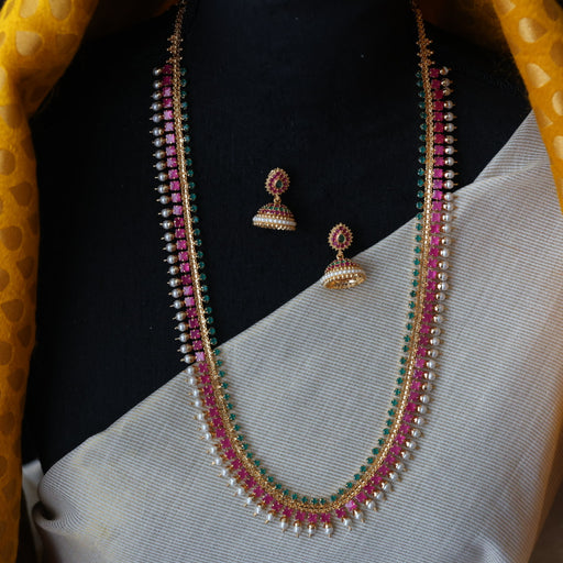 View full detailsHeritage gold plated ruby green stone long necklace with earrings HL9367