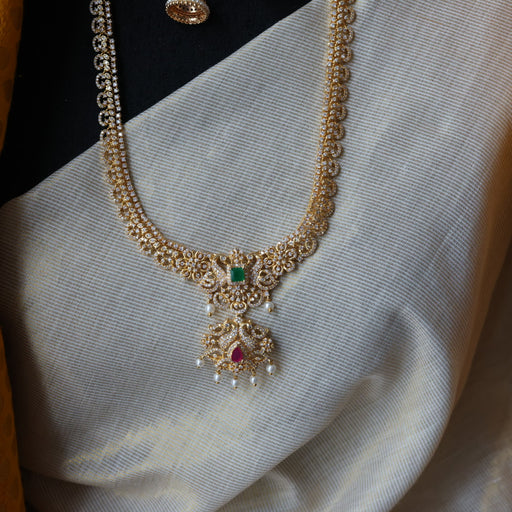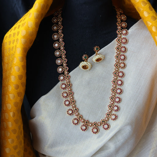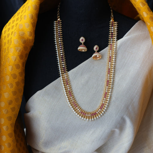 View full detailsHeritage gold plated ruby white stone long necklace with earrings HL9311