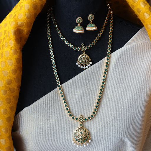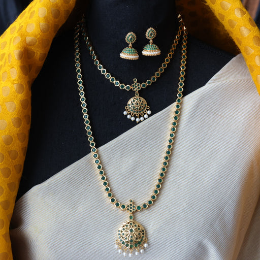 View full detailsHeritage gold plated green stone long and short necklace with earrings HLS1228