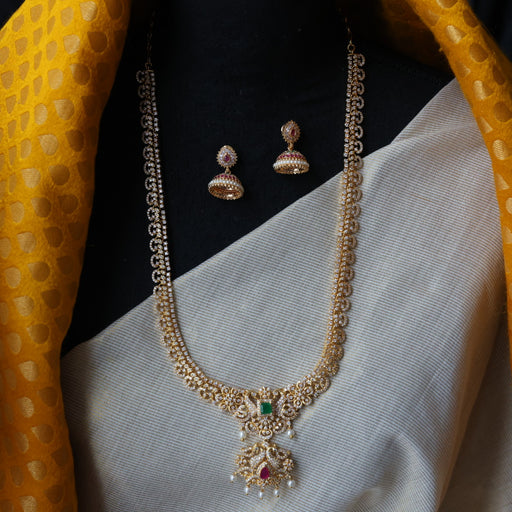 View full detailsHeritage gold plated ruby white stone long necklace with earrings HL9332