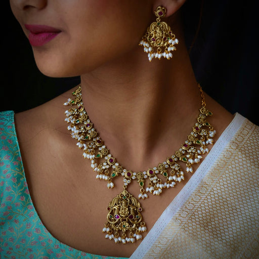 View full detailsHeritage ruby white stone short necklace with earrings TTH1569