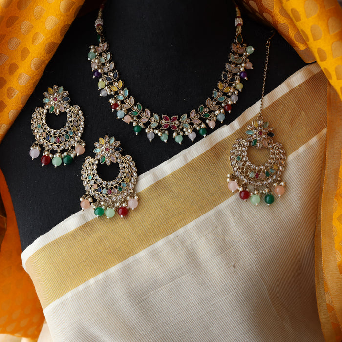 Trendy multi colour bead short necklace with earrings and tikka TM007