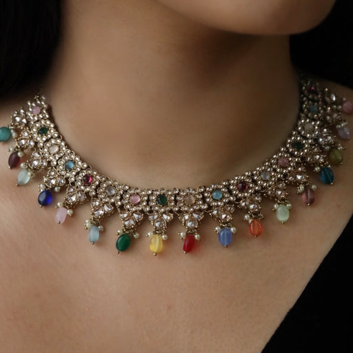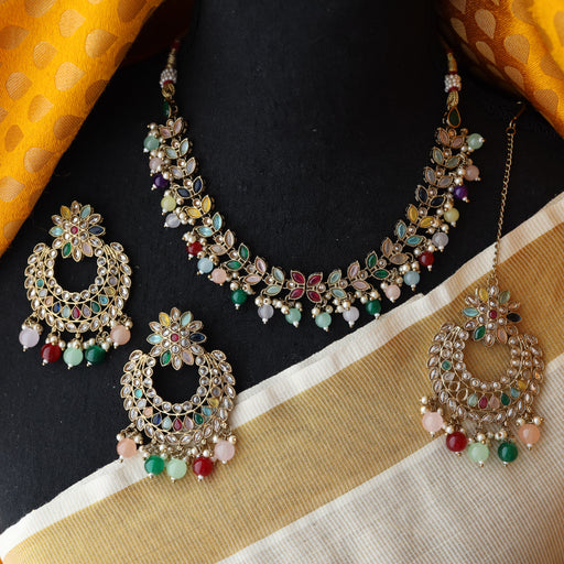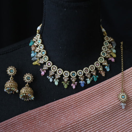 View full detailsTrendy multi colour stone short necklace with earrings and tikka TM009