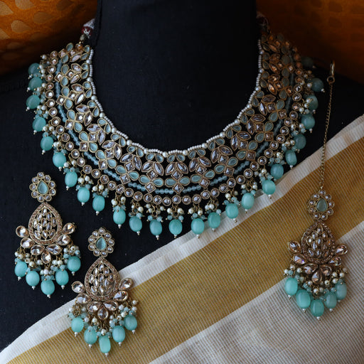 Trendy blue stone short necklace and earrings and tikka TG002
